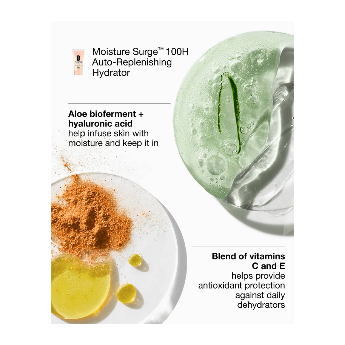 ● Moisture Surge™ 100H Auto Replenishing Hydrator αντιμετωπίζει τους καθημερινούς παράγοντες αφυδάτωσης. Ανάλαφρη υφή gel, που απορροφάται στην επιδερμίδα για ενυδάτωση που διαρκεί έως 100 ώρες και επιδερμίδα με πιο δυνατή αίσθηση που φαίνεται λαμπερή.