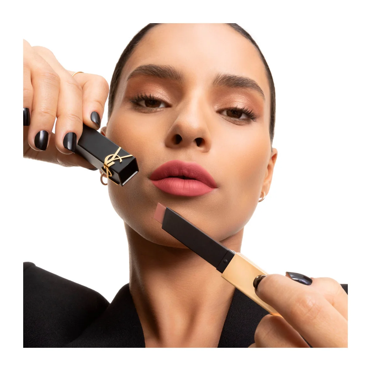 Δερμάτινο ματ αποτέλεσμα σε ένα λοξοτομημένο σχήμα. Απόλυτη ακρίβεια. Έντονο χρώμα και πλήρης κάλυψη. Ευέλικτο και άνετο όλη την ημέρα. Χρώμα couture – αποτέλεσμα ματ – και διάρκεια όλη την ημέρα. Με την υπογραφή Yves Saint Laurent.